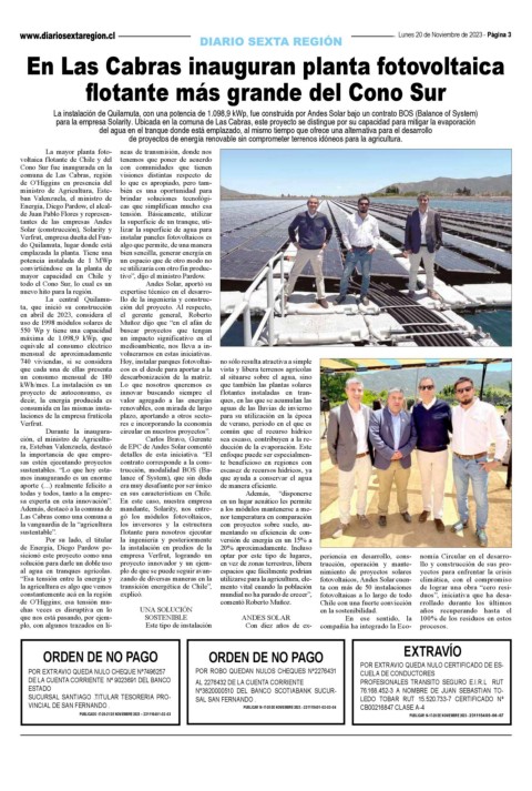 para la empresa Solarity. Ubicada en la comuna de Las Cabras, este proyecto se distingue por su capacidad para mitigar la evaporación