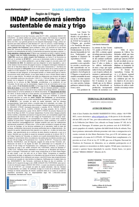 Ante el 2º Juzgado Civil de San Fernando, autos Rol Nº C-952-, caratulados “BANCO DE dicados a la agricultura, es