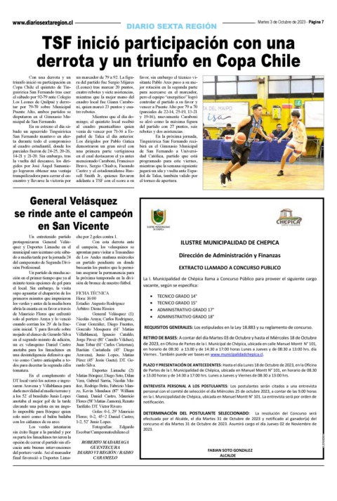 una desinteligencia defensiva que Aravena), Junio Lopes, Matías Viernes . También puede ver bases en www.municipalidadchepica.cl.
