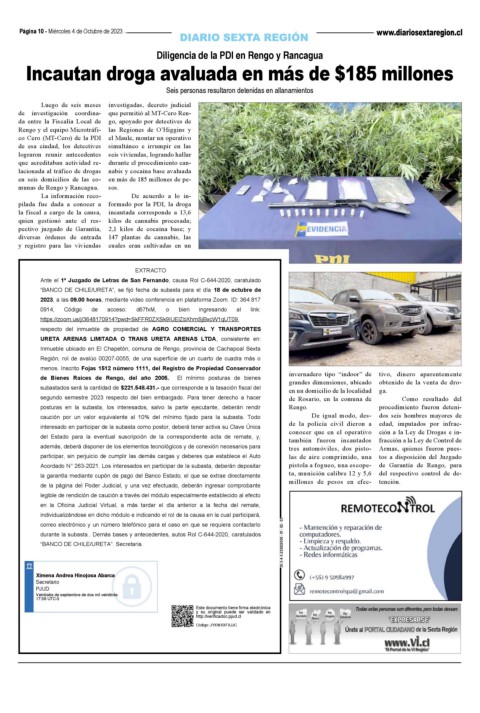 del Estado para la eventual suscripción de la correspondiente acta de remate, y, conocer que en el operativo ción a la Ley de Drogas e in-