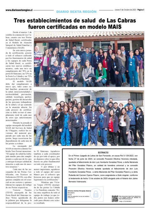jado mucho para dar cumpli- de eje por todo el apoyo, por En el Primer Juzgado de Letras de San Fernando, en causa Rol V-128-2022, con