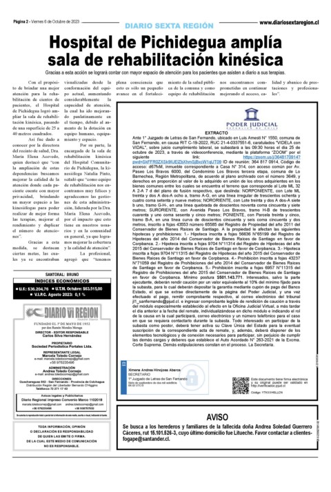 quien destacó que “con del Hospital Comunita- VIDAL", sobre juicio cumplimiento laboral, se subastará a las 09:30 horas el día 25 de