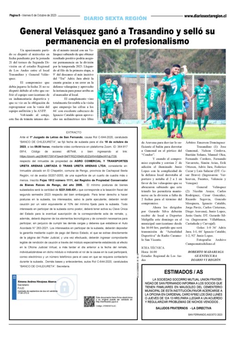 subastados será la cantidad de $221.548.431.- que corresponde a la tasación fiscal del ficiente el balón para derrotar Trasandino (1): Jose