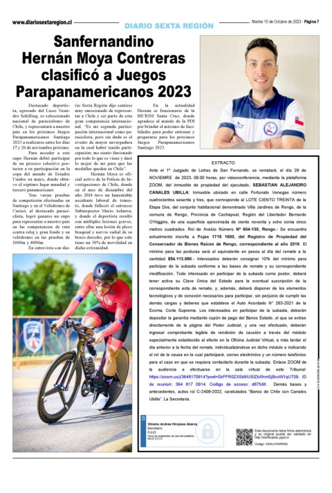 terior a su participación en la medallas queden en Chile”. Ante el 1º Juzgado de Letras de San Fernando, se rematará, el día 29 de