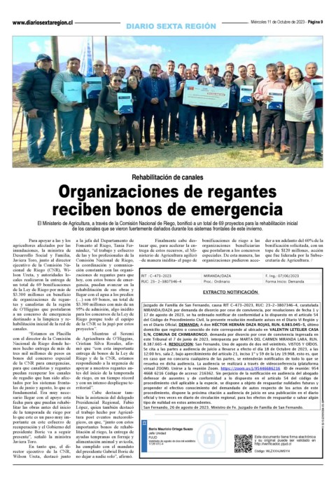 de la temporada de riego por el trabajo hecho por Agricul- San Fernando, 26 de agosto de 2023. Ministro de Fe. Juzgado de Familia de San Fernando.
