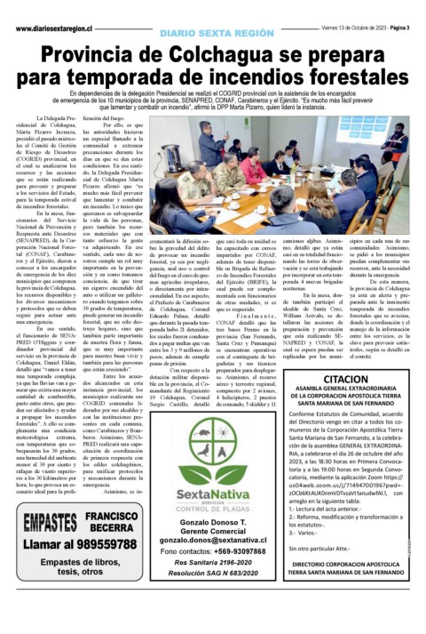PRED O’Higgins y coor- de nuestra flora y fauna, dos a pagar multas que van Santa Cruz y Pumanque) NAPRED y CONAF, la clave para prevenir catás-