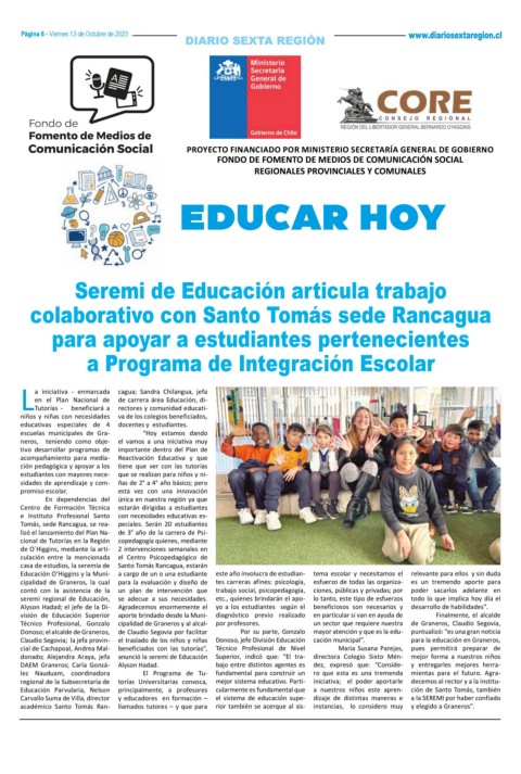 académico Santo Tomás Ran- llamados tutores – y que para rior también se acerque al sis- instancias, lo considero muy y elegido a Graneros”.