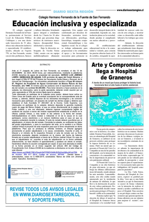 Ante el 1º Juzgado de Letras de San Fernando, se rematará, el día 13 de funcionaria llevó el arte hasta el recinto asistencial.