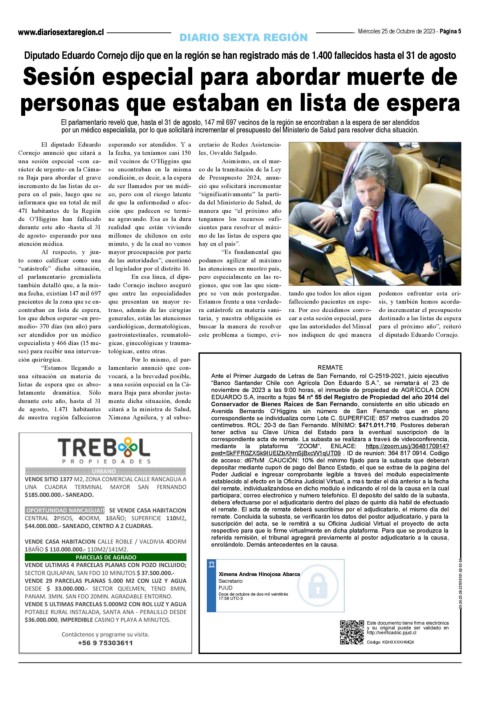 listas de espera que es abso- a una sesión especial en la Cá- “Banco Santander Chile con Agrícola Don Eduardo S.A.”, se rematará el 23 de