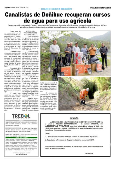 Convenio de colaboración entre la División y la Asociación de Canalistas de Rinconada de Doñihue busca mantener la operación del Canal del Cerro,