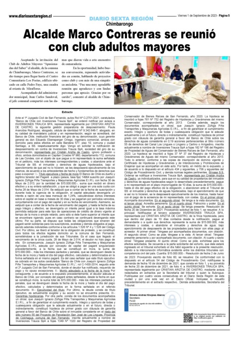 Banco de Chile, por concepto del pagaré antes señalados, desde la fecha en que Publíquese por cuatro veces consecutivas en el Diario Sexta Región de esta 29-30-31-1-230828301-02-03-04-05