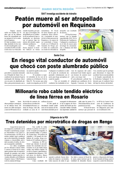 en las últimas horas 216 la localidad de Rosario, co- descubierto cuando carabi- carriles del Estado que des- pensión de servicios. Rengo se hiciera cargo de