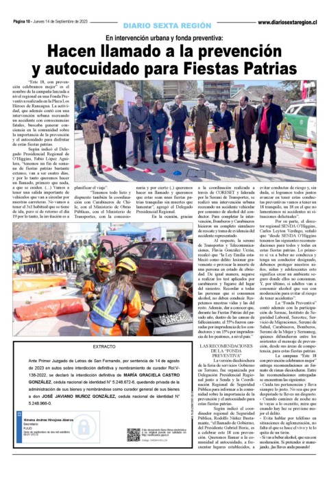 GONZÁLEZ, cédula nacional de identidad N° 5.248.672-6, quedando privada de la ciones, Flavia González Urzúa, estas fiestas patrias. Lo prime-