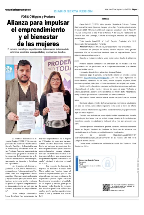 el emprendimiento Diaz Lorena Francisca”, Segundo Juzgado Letras San Fernando ordenó rematar
