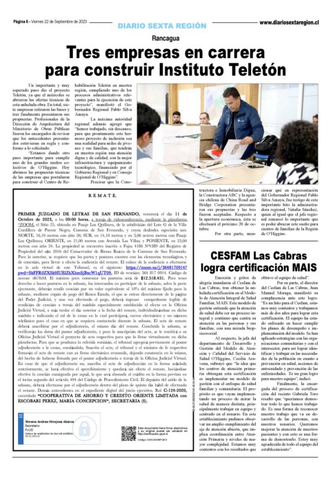 anteriormente, se har efectivo el apercibimiento y quedar sin efecto el remate, haci ndose Las Cabras, tras obtener la an- del Cesfam de Las Cabras, Juan