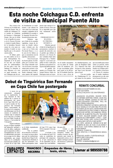 un Colchagua que ha caí- cinco puntos del segundo Rancagua tenía en la pre- de tres a uno a favor de Con este resulta- que el cuadro mimbrero