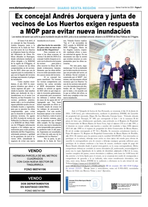 Los vecinos del sector que sufrió la grave inundación de julio de 2023, junto a la ex autoridad comunal, oficiaron a la SEREMI de Obra Públicas de O’Higgins.
