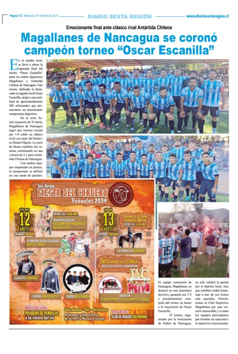 Página 12 - Miércoles 10 de Abril de 2024 www.diariosextaregion.cl Página 12 - Miércoles 10 de Abril de 2024 Emocionante final ante clásico rival Antártida Chilena Magallanes de Nancagua se coronó campeón torneo “Oscar Escanilla”