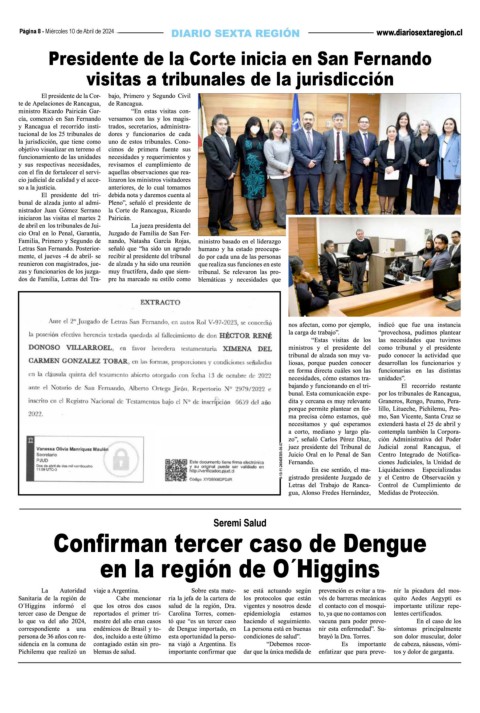 Página 8 - Miércoles 10 de Abril de 2024 Presidente de la Corte inicia en San Fernando visitas a tribunales de la jurisdicción 9-10-11-240408305-06-07 Seremi Salud Confirman tercer caso de Dengue en la región de O´Higgins