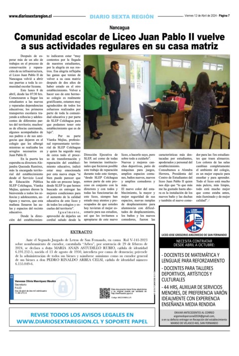 WWW.DIARIOSEXTAREGION.CL Y SOPORTE PAPEL o en su defecto entregar en Recepción del establecimiento