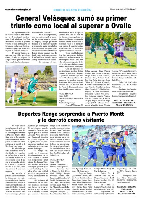 Martes 16 de Abril de 2024 - Página 7 General Velásquez sumó su primer triunfo como local al superar a Ovalle Deportes Rengo sorprendió a Puerto Montt y lo derrotó como visitante