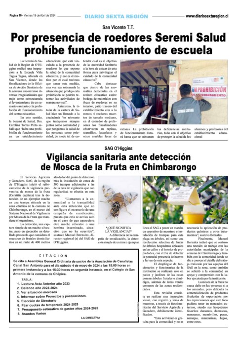 Página 10 - Viernes 19 de Abril de 2024 San Vicente T.T. Por presencia de roedores Seremi Salud prohíbe funcionamiento de escuela SAG O’Higgins Vigilancia sanitaria ante detección de Mosca de la Fruta en Chimbarongo 19-23-2404018502-03