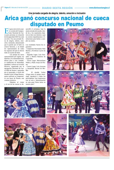 Página 12 - Miércoles 24 de Abril de 2024 www.diariosextaregion.cl Página 12 - Miércoles 24 de Abril de 2024 Una jornada cargada de alegría, talento, emoción e inclusión Arica ganó concurso nacional de cueca disputado en Peumo