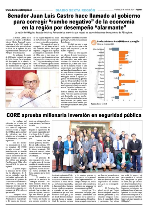 La región de O’Higgins, después de Arica y Parinacota fue una de las que registró los peores indicadores de crecimiento del PBI regional.