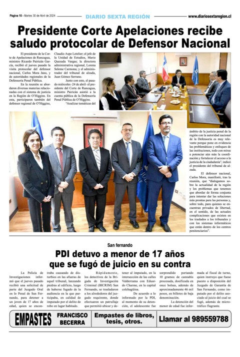 Página 10 - Martes 30 de Abril de 2024 Presidente Corte Apelaciones recibe saludo protocolar de Defensor Nacional San fernando PDI detuvo a menor de 17 años que se fugó de juicio en su contra FRANCISCO Llamar al 989559788 BECERRA