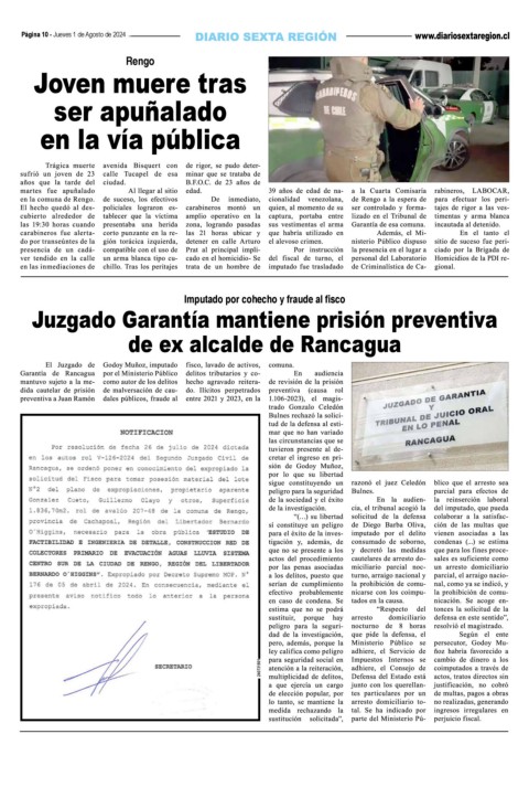 Página 10 - Jueves 1 de Agosto de 2024 Rengo Joven muere tras ser apuñalado en la vía pública Imputado por cohecho y fraude al fisco Juzgado Garantía mantiene prisión preventiva de ex alcalde de Rancagua 240731801