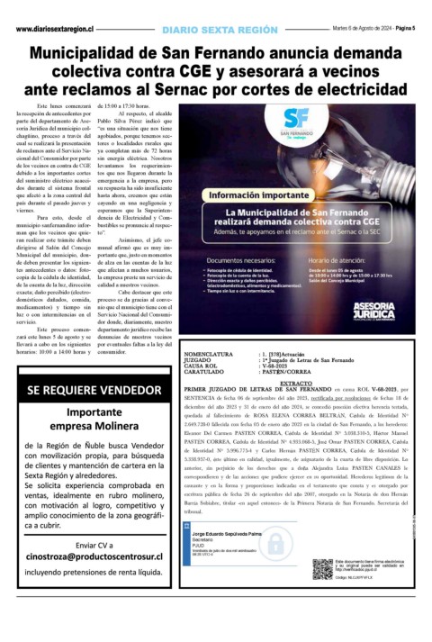 ñ JUZGADO DE LETRAS DE SAN FERNANDO en causa ROL VV-68-2023, por