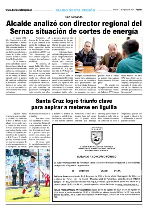 Martes 13 de Agosto de 2024 - Página 5 San Fernando Alcalde analizó con director regional del Sernac situación de cortes de energía Santa Cruz logró triunfo clave para aspirar a meterse en liguilla 240808601