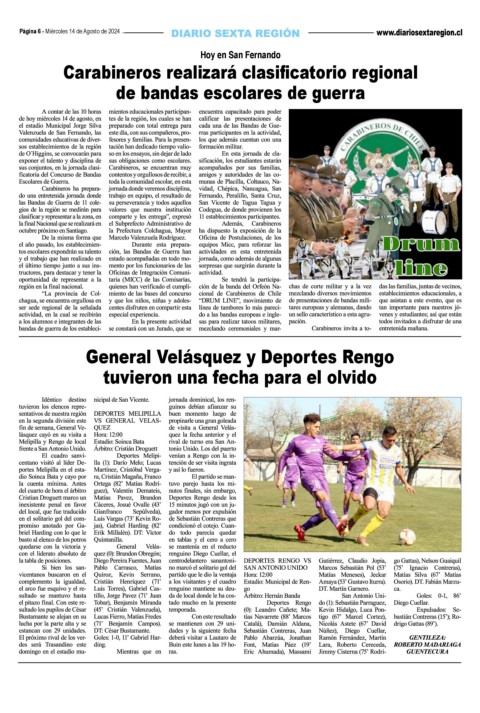 Página 6 - Miércoles 14 de Agosto de 2024 Hoy en San Fernando Carabineros realizará clasificatorio regional de bandas escolares de guerra General Velásquez y Deportes Rengo tuvieron una fecha para el olvido
