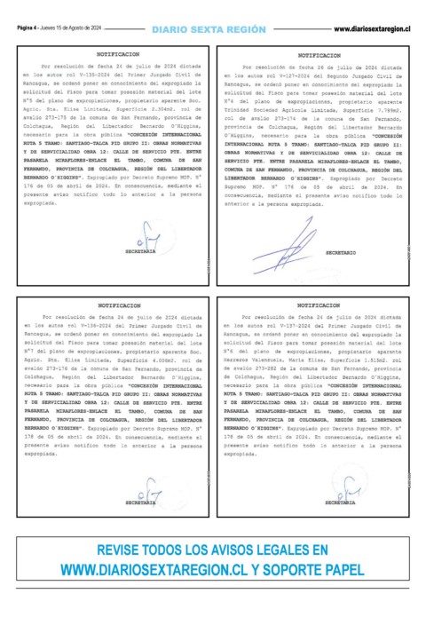 Página 4 - Jueves 15 de Agosto de 2024 240814801 240814804 240814805 240814806 REVISE TODOS LOS AVISOS LEGALES EN WWW.DIARIOSEXTAREGION.CL Y SOPORTE PAPEL
