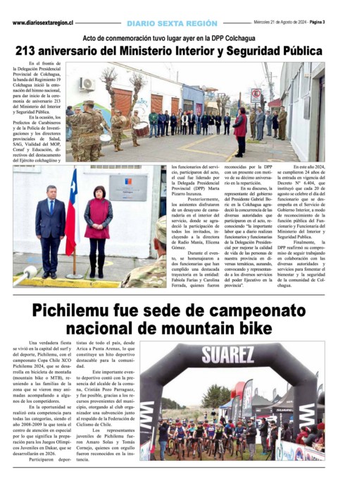 Miércoles 21 de Agosto de 2024 - Página 3 Acto de conmemoración tuvo lugar ayer en la DPP Colchagua 213 aniversario del Ministerio Interior y Seguridad Pública Pichilemu fue sede de campeonato nacional de mountain bike