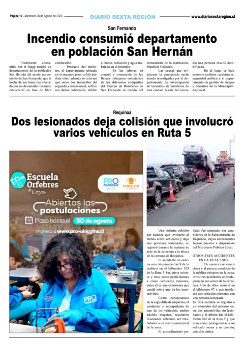 Página 10 - Miércoles 28 de Agosto de 2024 San Fernando Incendio consumió departamento en población San Hernán Requínoa Dos lesionados deja colisión que involucró varios vehículos en Ruta 5