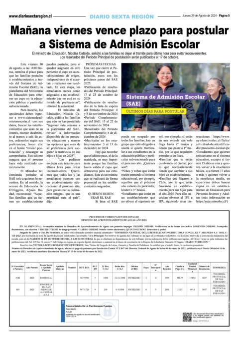 419 2023 PEDRO DE Veintiséis de agosto de dos mil veinticuatro 9 259 6-3-1998 PICHILEMU 6 5 2001 253,5 405,6 3847 DE SAN