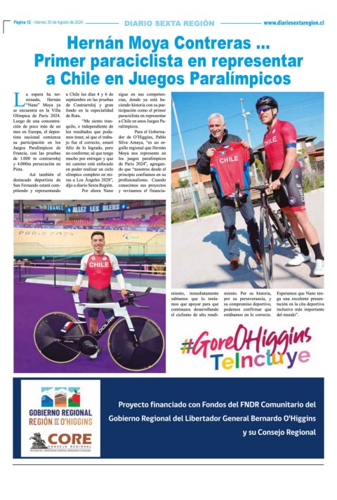 Página 12 - Viernes 30 de Agosto de 2024 www.diariosextaregion.cl Página 12 - Viernes 30 de Agosto de 2024 Hernán Moya Contreras … Primer paraciclista en representar a Chile en Juegos Paralímpicos