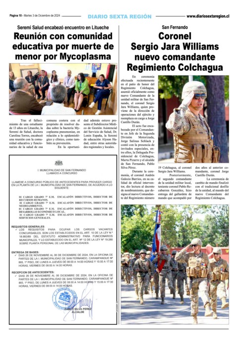 Página 10 - Martes 3 de Diciembre de 2024 Seremi Salud encabezó encuentro en Litueche San Fernando Reunión con comunidad Coronel educativa por muerte de Sergio Jara Williams menor por Mycoplasma nuevo comandante Regimiento Colchagua 241202601-02