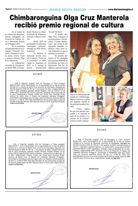 Página 6 - Martes 2 de Enero de 2024 Chimbaronguina Olga Cruz Manterola recibió premio regional de cultura 231229802 231229803 231229801
