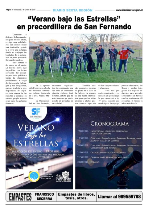 Página 4 - Miércoles 3 de Enero de 2024 “Verano bajo las Estrellas” en precordillera de San Fernando FRANCISCO Llamar al 989559788 BECERRA