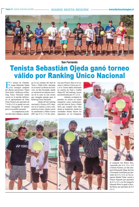 Página 12 - Viernes 19 de Enero de 2024 www.diariosextaregion.cl Página 12 - Viernes 19 de Enero de 2024 San Fernando Tenista Sebastián Ojeda ganó torneo válido por Ranking Único Nacional