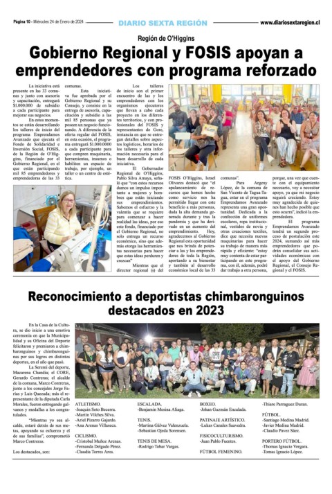 Página 10 - Miércoles 24 de Enero de 2024 Región de O’Higgins Gobierno Regional y FOSIS apoyan a emprendedores con programa reforzado Reconocimiento a deportistas chimbaronguinos destacados en 2023