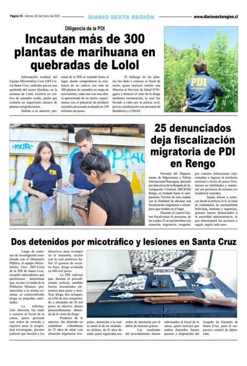 Página 10 - Viernes 26 de Enero de 2024 Diligencia de la PDI Incautan más de 300 plantas de marihuana en quebradas de Lolol 25 denunciados deja fiscalización migratoria de PDI en Rengo Dos detenidos por micotráfico y lesiones en Santa Cruz