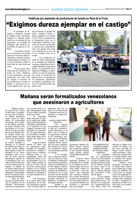 Martes 30 de Enero de 2024 - Página 9 Fedefruta por asesinato de productores de tomate en Ruta de la Fruta: “Exigimos dureza ejemplar en el castigo” Mañana serán formalizados venezolanos que asesinaron a agricultores