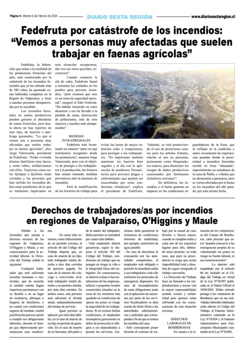 Página 4 - Martes 6 de Febrero de 2024 Fedefruta por catástrofe de los incendios: “Vemos a personas muy afectadas que suelen trabajar en faenas agrícolas” Derechos de trabajadores/as por incendios en regiones de Valparaíso, O’Higgins y Maule
