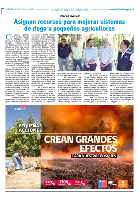 Página 12 - Martes 13 de Febrero de 2024 www.diariosextaregion.cl Página 12 - Martes 13 de Febrero de 2024 Histórica inversión Asignan recursos para mejorar sistemas de riego a pequeños agricultores