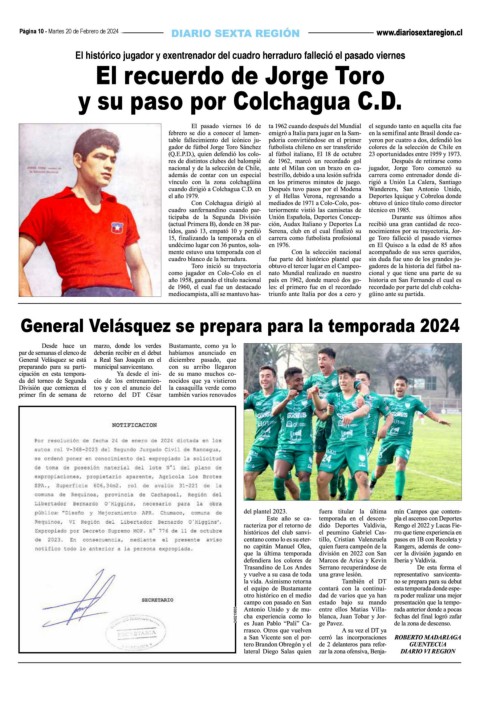 Página 10 - Martes 20 de Febrero de 2024 El histórico jugador y exentrenador del cuadro herraduro falleció el pasado viernes El recuerdo de Jorge Toro y su paso por Colchagua C.D. General Velásquez se prepara para la temporada 2024 240219805