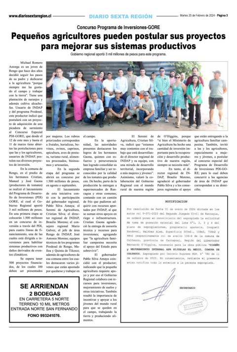 Martes 20 de Febrero de 2024 - Página 3 Concurso Programa de Inversiones-GORE Pequeños agricultores pueden postular sus proyectos para mejorar sus sistemas productivos Gobierno regional aportó 3 mil millones de pesos para este programa. 240219801