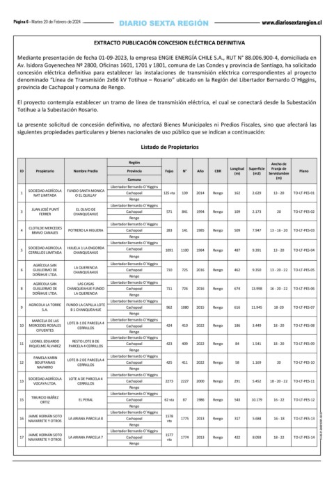 13 Cachapoal 2273 2227 2000 Rengo 291 5.452 18 - 20 - 22 TO-LT-PES-11